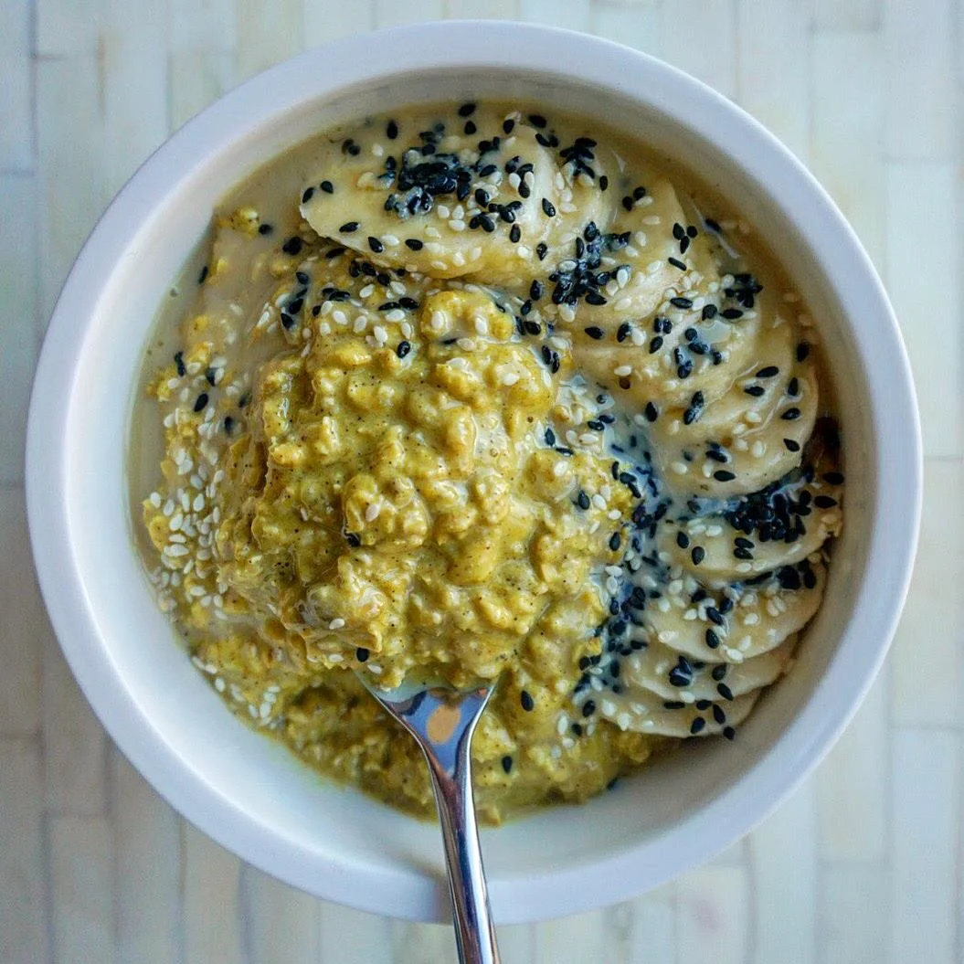 In a bowl large enough to fit all of the ingredients, whisk together the coconut milk and tahini until completely smooth and combined. Next add the ripe banana and mash with a fork until it is creamy. Then add the oats, turmeric, cinnamon, maple syrup and pinch of sea salt. Mix everything until well combined. Cover bowl with lid or tinfoil and place in the fridge overnight. The next morning top with sliced banana, drizzle of maple syrup, some more tahini and black and white seeds.